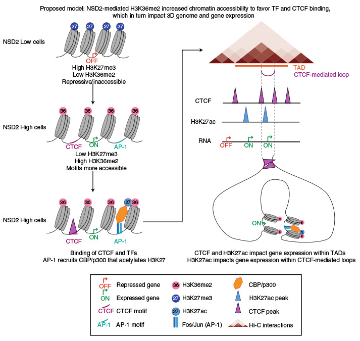 CTCF and cohesin play a key role in organizing chromatin into topologically associating domain (TAD) structures. Disruption of a single CTCF binding site is sufficient to change chromosomal interactions leading to alterations in chromatin modifications and gene regulation. However, the extent to which alterations in chromatin modifications can disrupt 3D chromosome organization leading to transcriptional changes is unknown. In multiple myeloma, a 4;14 translocation induces overexpression of the histone methyltransferase, NSD2, resulting in expansion of H3K36me2 and shrinkage of antagonistic H3K27me3 domains. Using isogenic cell lines producing high and low levels of NSD2, here we find oncogene activation is linked to alterations in H3K27ac and CTCF within H3K36me2 enriched chromatin. A logistic regression model reveals that differentially expressed genes are significantly enriched within the same insulated domain as altered H3K27ac and CTCF peaks. These results identify a bidirectional relationship between 2D chromatin and 3D genome organization in gene regulation.