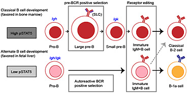 B-1a cells are long-lived, self-renewing innate-like B cells that predominantly inhabit the peritoneal and pleural cavities. In contrast to conventional B-2 cells, B-1a cells have a receptor repertoire that is biased towards bacterial and self-antigens, promoting a rapid response to infection and clearing of apoptotic cells. Although B-1a cells are known to primarily originate from fetal tissues, the mechanisms by which they arise has been a topic of debate for many years. Here we show that in the fetal liver versus bone marrow environment, reduced IL-7R/STAT5 levels promote immunoglobulin kappa gene recombination at the early pro-B cell stage. As a result, differentiating B cells can directly generate a mature B cell receptor (BCR) and bypass the requirement for a pre-BCR and pairing with surrogate light chain. This ‘alternate pathway’ of development enables the production of B cells with self-reactive, skewed specificity receptors that are peculiar to the B-1a compartment. Together our findings connect seemingly opposing lineage and selection models of B-1a cell development and explain how these cells acquire their unique properties.