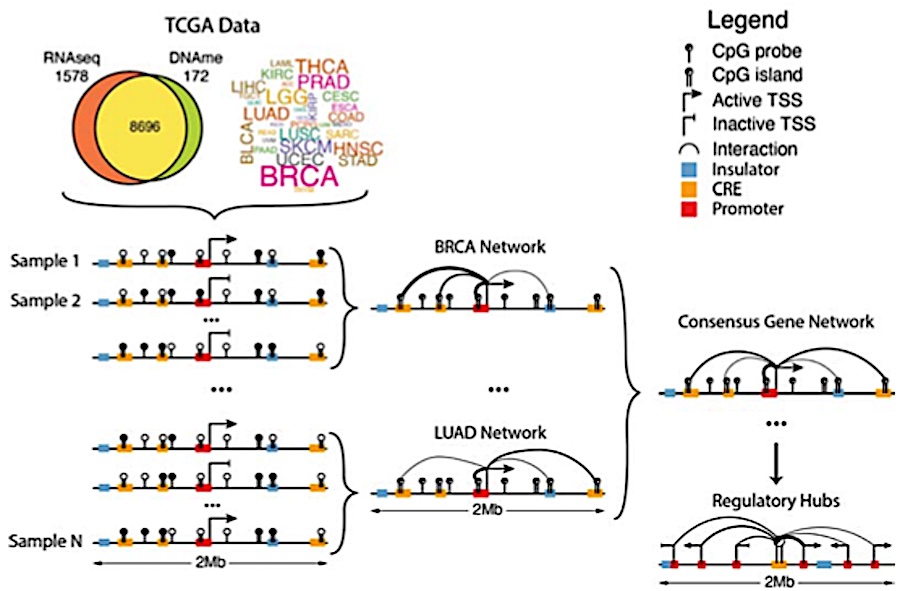 Aberrations in the capacity of DNA/chromatin modifiers and transcription factors to bind non-coding regions can lead to changes in gene regulation and impact disease phenotypes. However, identifying distal regulatory elements and connecting them with their target genes remains challenging. Here, we present MethNet, a pipeline that integrates large-scale DNA methylation and gene expression data across multiple cancers, to uncover novel cis regulatory elements (CREs) in a 1Mb region around every promoter in the genome. MethNet identifies clusters of highly ranked CREs, referred to as ‘hubs’, which contribute to the regulation of multiple genes and significantly affect patient survival. Promoter-capture Hi-C confirmed that highly ranked associations involve physical interactions between CREs and their gene targets, and CRISPRi based scRNA Perturb-seq validated the functional impact of CREs. Thus, MethNet-identified CREs represent a valuable resource for unraveling complex mechanisms underlying gene expression, and for prioritizing the verification of predicted non-coding disease hotspots.